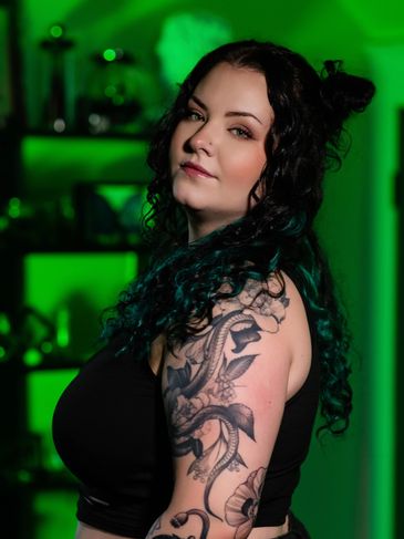 Taylor has been interested in various forms of art since she was young. She studied visual art at Weaver Academy, where she began to form her own style of portraiture with fantasy & magical elements. After graduating, she continued to expand her portfolio and became a licensed tattoo artist in May of 2021. Taylor enjoys tattooing fine-line, floral, glitter realism and any video game characters, and she especially loves an opportunity to create one of her magical lady faces.
